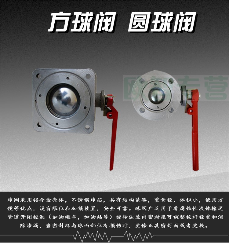 綠化灑水車配件-直通球閥 直通球閥又稱二通球閥,方法蘭,鋁合金產品,防腐防銹。直通球閥用途:廣泛使用在灑水車,油罐車,化工車,消防車等專用汽車上直通球閥型號:DN50,DN65,DN80,DN100。直通球閥特點:球閥采用鋁合金殼體,不銹鋼球芯,具有材料配制合理結構緊湊,重量輕,體積小,使用方便等優點,設有限位和加鎖裝置,安全可靠。直通球閥調整:旋轉法蘭內密封座可調整板桿輕重和消除滲漏,當密封環與球面封部位有損傷時,要修正其密封面或者更換。