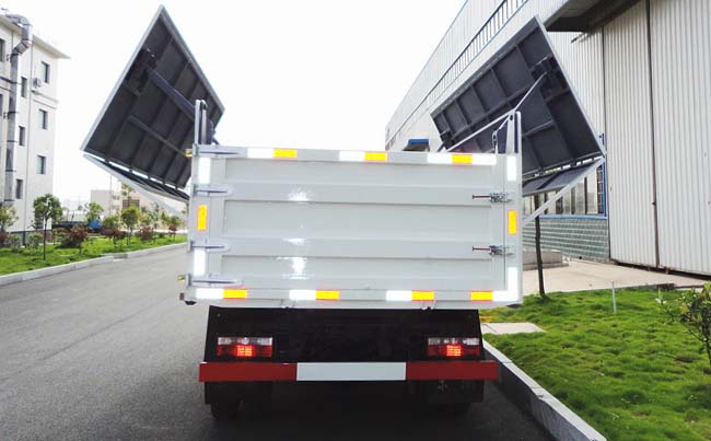 箱體容積7~8立方米,自卸式箱體,箱長4.3米,箱寬1.95米,箱高0.8米,采用4毫米厚鋼板制作,箱頂帶液壓蓋板,可向兩邊展開折疊,箱底雙缸液壓自卸,手動(dòng)尾門。