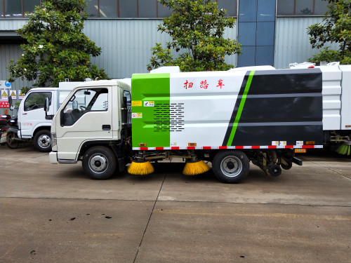 該掃路車采用福田國五二類底盤改裝,加裝副發動機、風機、清水箱、垃圾箱、左右立掃、后置吸盤,掃盤降塵系統,液壓系統、專用裝置電控系統和副車架等改裝而成(可加裝前沖后灑)