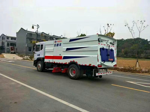 清掃車上裝配置:本洗掃車采用解放型國五二類底盤改裝,加裝康明斯170馬力副發動機、北玻臺信大功率耐磨免維護離心風機、16MPa高壓水泵、8.5/9.5立方米清水箱、7立方米垃圾箱、左右立掃、帶噴水桿的寬吸嘴、低壓沖洗系統、垃圾箱自潔,掃盤降塵系統,液壓系統、專用裝置電控系統和副車架等改裝而成。
