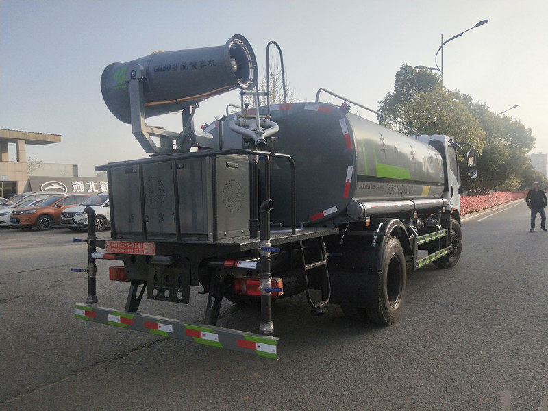1、灑水車前裝有鴨形噴嘴或圓頭沖嘴,后面裝有圓柱開灑水噴嘴或蓮蓬頭噴嘴,后部有一工作平臺(tái),裝配有水炮。后部還可裝8個(gè)噴嘴(選裝);