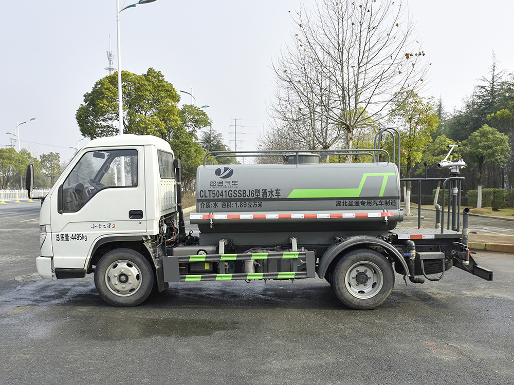 福田小卡 3 方小型灑水車產品主要技術參數 序號 名稱 型號、規格 1 整車型號 CLT5041GSSBJ6 型灑水車 2 發動機型號 Q23-115C60 3 發動機馬力/功率 全柴 115 馬力/85KW 4 發動機排量 2300ML 5 變速箱 萬里揚 5 檔 6 輪胎規格 6.50 鋼絲胎 7 軸距 2850 8 總質量 4495KG 9 整備質量 2560KG 10 額定載質量 1805KG 11 整車尺寸(長×寬×高) 5.47*1.98*2.2 12 罐體容積 2.2 方 13 燃料種類 柴油 14 排放標準 國六 15 水泵型號 40/50 16 罐體材質 Q235 碳鋼四. 產品功能展示 后對沖 后灑 側噴 高炮