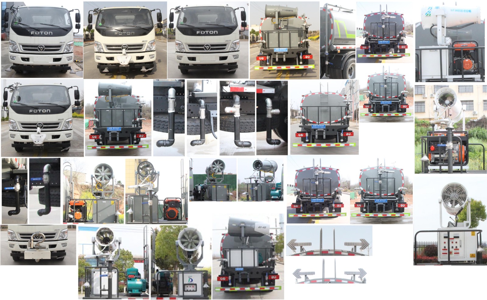 福田10方灑水車產品標配前噴(鴨嘴)、后沖、后灑、側噴、后置式工作 平臺,平臺上配置綠化水炮(可 360°旋轉,既可以調成柱狀,也可 以調成霧狀,更可以調成直沖狀、大雨、中雨、小雨、毛毛雨),配 備優質大功率專用灑水泵(可自吸自排,可從河里或池塘抽水到罐體), 取力器,雜物過濾網,消防接口,自流球閥系統、取力器、球閥、濾網 均為國家標準產品,主管道加粗,法蘭墊、法蘭盤加厚,大通徑球閥。 整體具備性能優良安全可靠、效率高、流量大、維修方便等特點