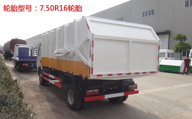 容積7~8立方米,方形密封式箱體,材質邊三底四,國產(chǎn)油泵、多路閥、取力器、液壓油缸,駕駛室外部操作,箱體底部雙杠液壓舉升卸料,箱體后門液壓開啟。