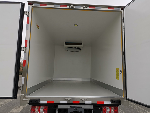 國六江鈴凱運4米2冷藏車廂體配置為:采用斷橋隔熱工藝,整體框架結構制作,廂體內、外壁材料為玻璃鋼板,采用高密度保溫層,廂板內帶有骨架,廂體厚度80mm,門框,門飾件、包角全部使用不銹鋼材質。最新款鋁合金包邊型材,廂體內采用LED照明燈及廂體示寬燈;門框密封條為橡膠材質,后門梁帶加厚防撞塊,加厚型不銹鋼鉸鏈及鎖件。車體副梁采用510L高強度鋼制作,底板為鋁花紋板,車廂后門帶一個上車扶手,其余標配;