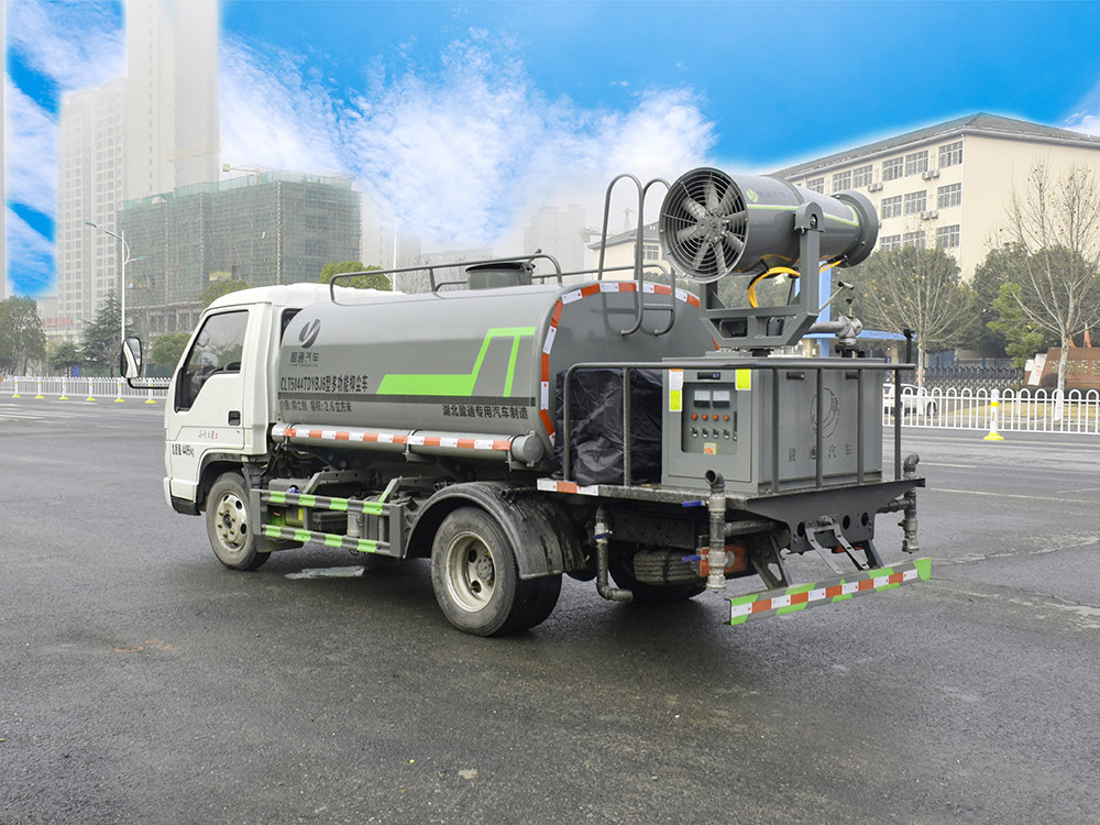 縱昂牌 CLT5044TDYBJ6A 型多功能抑塵車標配后對沖、后灑、側 噴、后置式工作平臺,平臺上配置綠化水炮可 360°旋轉,既可以調成柱狀, 也可以調成霧狀),配備優質大功率專用灑水泵,可自吸自排,可從河里或池 塘抽水到罐體,取力器,雜物過濾網,消防接口,自流球閥系統、取力器、球 閥、濾網均為國家標準產品,主管道加粗,法蘭墊、法蘭盤加厚,大通徑球閥。 整體具備性能優良安全可靠、效率高、流量大、維修方便等特點。
