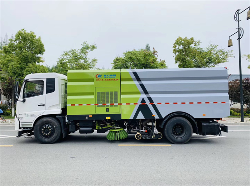 ● 國六東風天錦洗掃車具有路面清洗、路面清掃、路緣清洗、路緣和路緣石立面洗刷、低壓沖洗、噴霧除塵等多功能。有“全洗掃”、 “左洗掃”、 “右洗掃”、 “全掃”、 “左掃”、 “右掃”6種作業模式可選擇。選擇“全洗掃”模式清洗廣場和路面,清洗效率高效果好,洗凈率達90%以上。選擇“左洗掃”或“右洗掃”模式清洗路面和路緣、洗刷路緣石立面。需要進行路面清掃或路面保潔作業時,可選擇掃路模式。需要噴霧除塵時,可開啟噴霧裝置,進行噴霧除塵作業。可以像灑水車一樣對路面進行低壓沖洗作業。