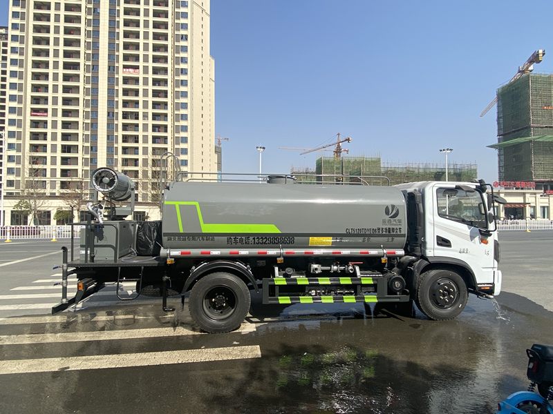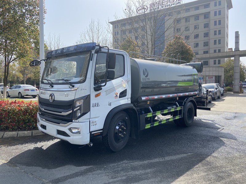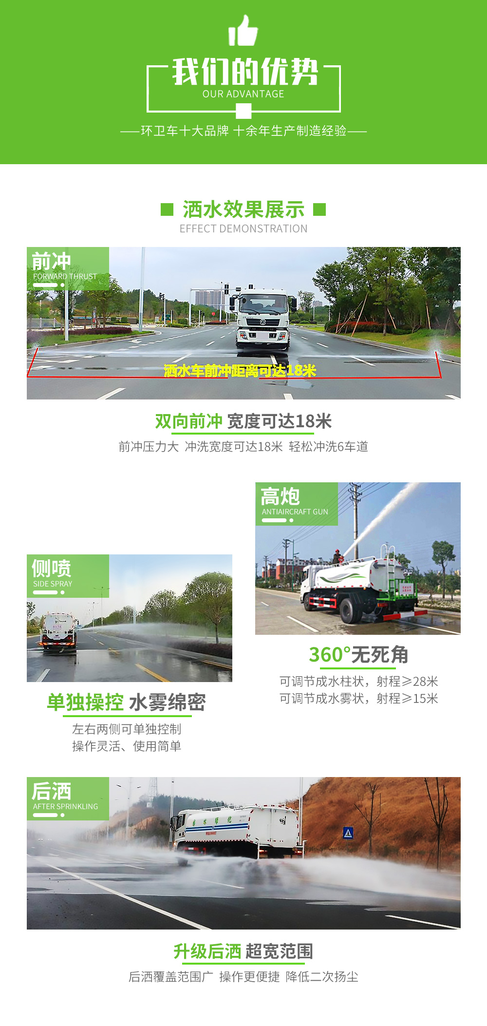 專用功能配置:罐體實際容積約為10立方米,公告有效參數8.1立方米、采用武鋼優質碳鋼板卷壓成型。配備專用灑水泵,自吸自排,前噴后灑、側噴、后工作平臺及灑水高壓炮。灑水泵自吸高度為6米左右,整車灑水寬度14米左右,后工作平臺水炮上下左右360旋轉可調成:直沖狀、大雨、中雨、小雨、霧狀,有效射程≥28米,整車帶接頭、水位計,自流閥。后工作平臺主管道有一個一寸的澆花接口,附送2根3米水管,1個爬梯,兩側及后保險杠。