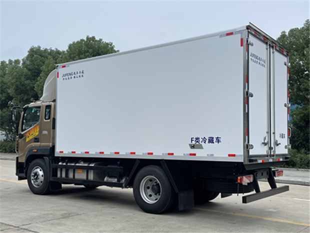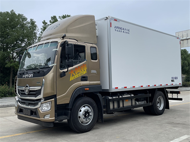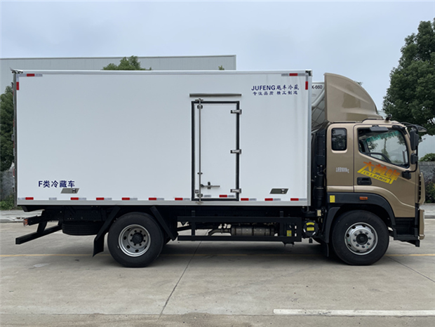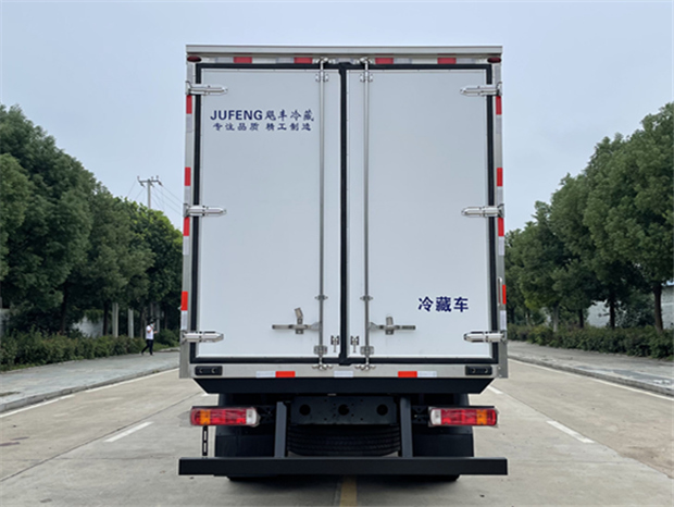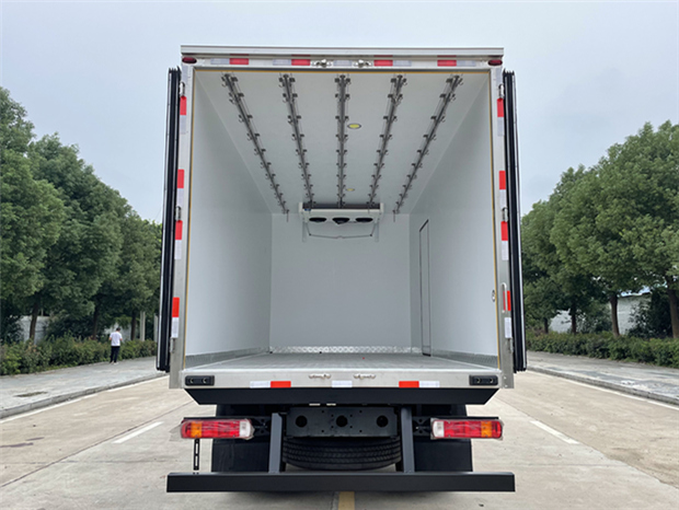 奧鈴大黃蜂6米8冷藏車廂體配置為:斷橋隔溫工藝,整體結構框架,內外面料為3mm新款啞光玻璃鋼夾保溫層真空復合而成,廂體厚度為8cm,最新款鋁合金包邊型材,型材局部厚度為4mm(鋼制鉚釘加固),廂體內部采用2個LED照明燈及廂體示寬燈,后門框不銹鋼材質,門框密封條為三元乙丙橡膠材質,加厚型不銹鋼合頁及鎖件;副梁為Q700車用大梁鋼,15mm厚大梁墊皮,加裝防撞膠塊,不銹鋼門鎖件,配后雙開門,副駕駛一側居中靠前開單側門一個,帶2個排水孔。