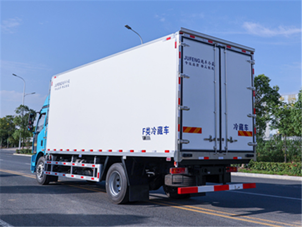 解放J6L 6米8冷藏車廂體配置為:斷橋隔溫工藝,整體結構框架,內外面料為3mm新款啞光玻璃鋼夾保溫層真空復合而成,廂體厚度為8cm,最新款鋁合金包邊型材,型材局部厚度為4mm(鋼制鉚釘加固),廂體內部采用2個LED照明燈及廂體示寬燈,后門框不銹鋼材質,門框密封條為三元乙丙橡膠材質,加厚型不銹鋼合頁及鎖件;副梁為Q700車用大梁鋼,15mm厚大梁墊皮,加裝防撞膠塊,不銹鋼門鎖件,配后雙開門,副駕駛一側居中靠前開單側門一個,帶2個排水孔。